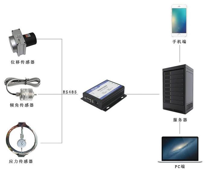 支持多种数据采集通讯方式,采用无线位移传感器,组网灵活,不需布线,维护方便。无线网关最终将接收到的信息通过GPRS/GSM/4G网络或者有线网络(以太网/RS485/RS232)上传到监控中心。